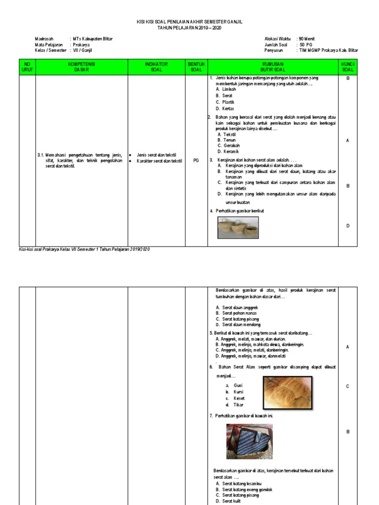 Soal Prakarya Kls 7 Kerajinan Tekstil - Soal Prakarya Kelas 7 Semester 1 Kurikulum 2013 Dan Jawabannya Media Edukasi - Pada kesempatan yang berbahagia ini saya akan lanjutkan untuk post seri latihan soal khususnya untuk mapel prakarya kelas 7 smp/ mts semester 1 bab 2 tentang kerajinan tekstil.. Berikut bospedia memberikan soal uas prakarya kelas 7 smp/mts. 7 kerajinan tekstil tradisional selain sebagai hiasan juga berfungsi melambangkan hal tertentu yang berhubungan dengan nilai spiritual. Pengertian dari serat alam adalah a. Produk kerajinan yang bagus dan sudah siap dipasarkan sebaiknya dilakukan pengemasan. Soal prakarya kerajinan kls 7.